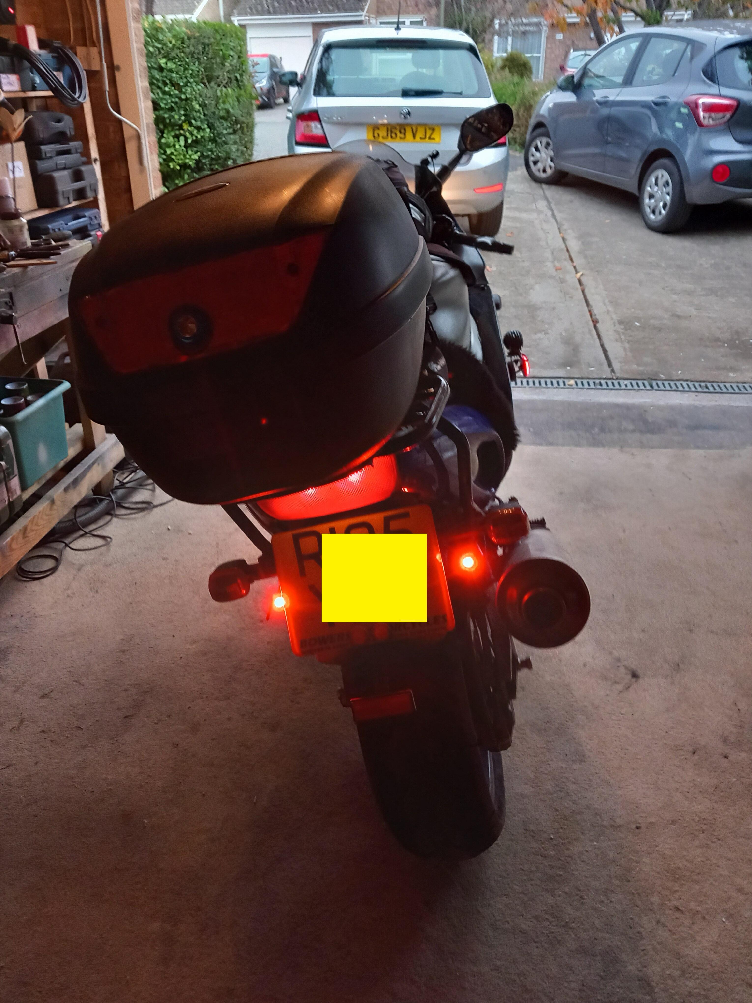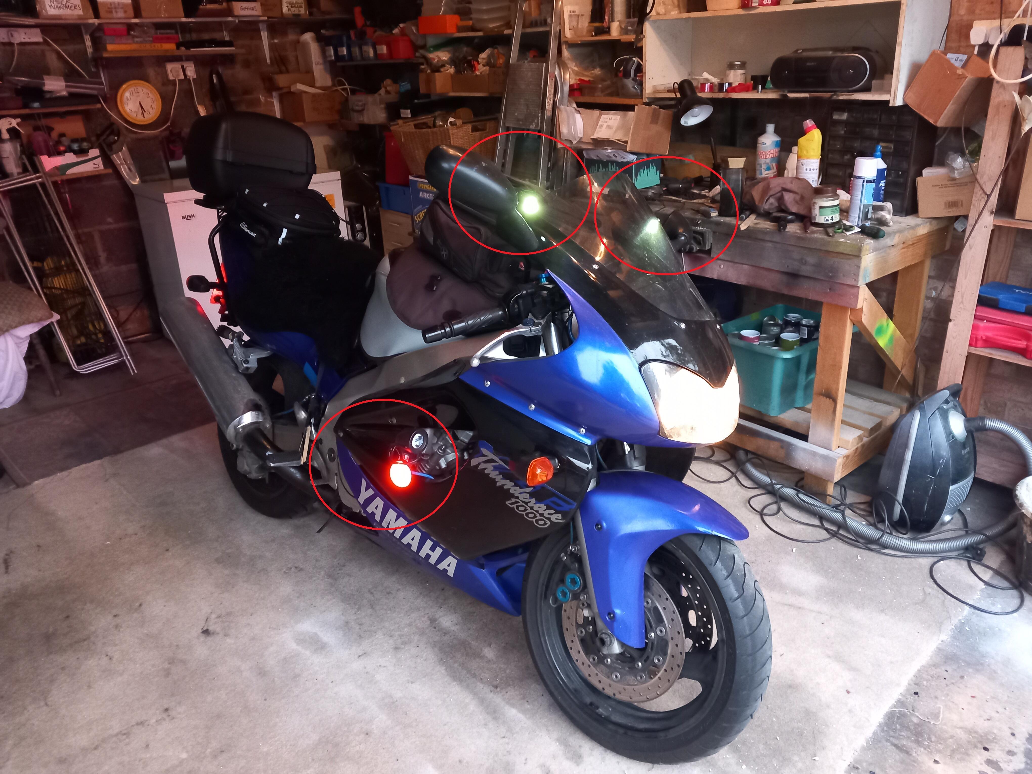 Posted 15 hours ago15 hr These are the running lights on my bike, two front, one either side and two at the back yet still i get peeps pulling out on me.changed the oil and filter today, book says oil change at 4K but i do 3K.next job is to wire in those spot lights you can just see down by the side lights, one each side.my thunderace is an early one 1997 with 50k miles, there's a later model on autotrader that i like:https://www.autotrader.co.uk/bike-details/202509226529043?advertising-location=at_bikesbut now isn't the time despite low prices.